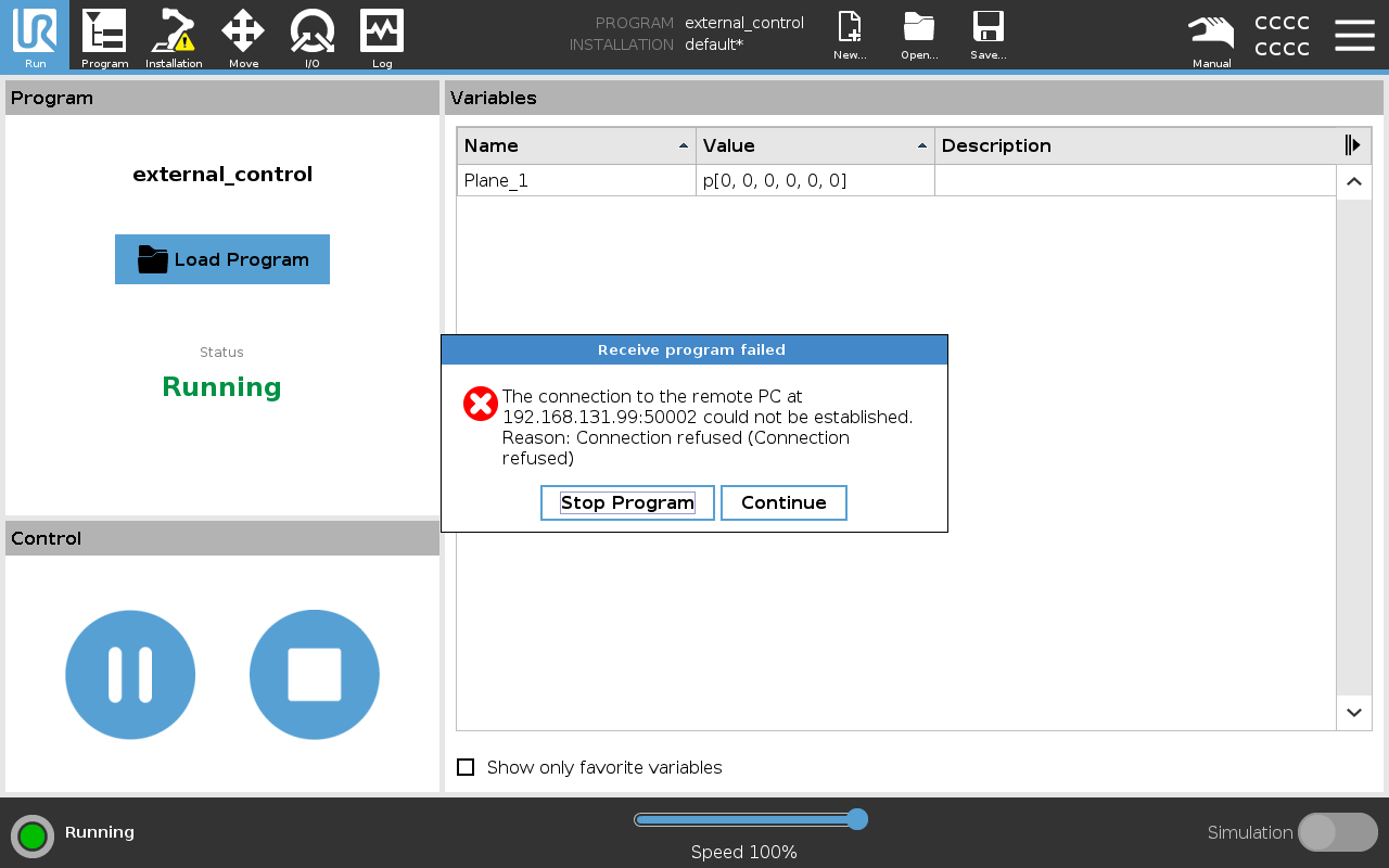 If the following error pop-up window appears, then ensure that the arm's URCap configuration matches the robot's computer and that the robot's computer is able to ping the arm. The error also indicates that the ROS driver is not currently running or has been stopped. Restart the clearpath-manipulators.service