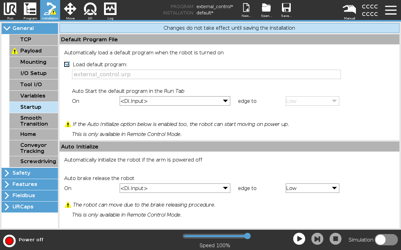 Now, set the program as default so that it is automatically loaded and ready to run on start-up. Navigate to the Installation/General/Startup page and set the external_control.urp