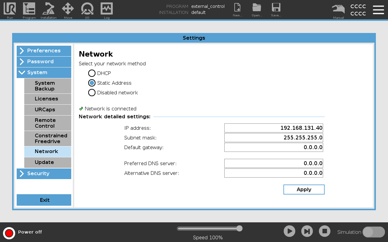 must be set to match the networking settings of the arm's control box. By default, we use the 192.168.131.40