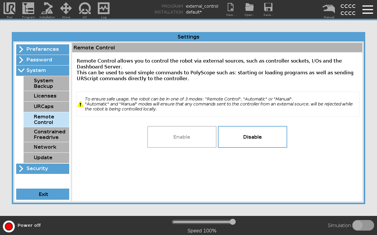 Once the robot is in normal mode, you can proceed to initialize the external control program.