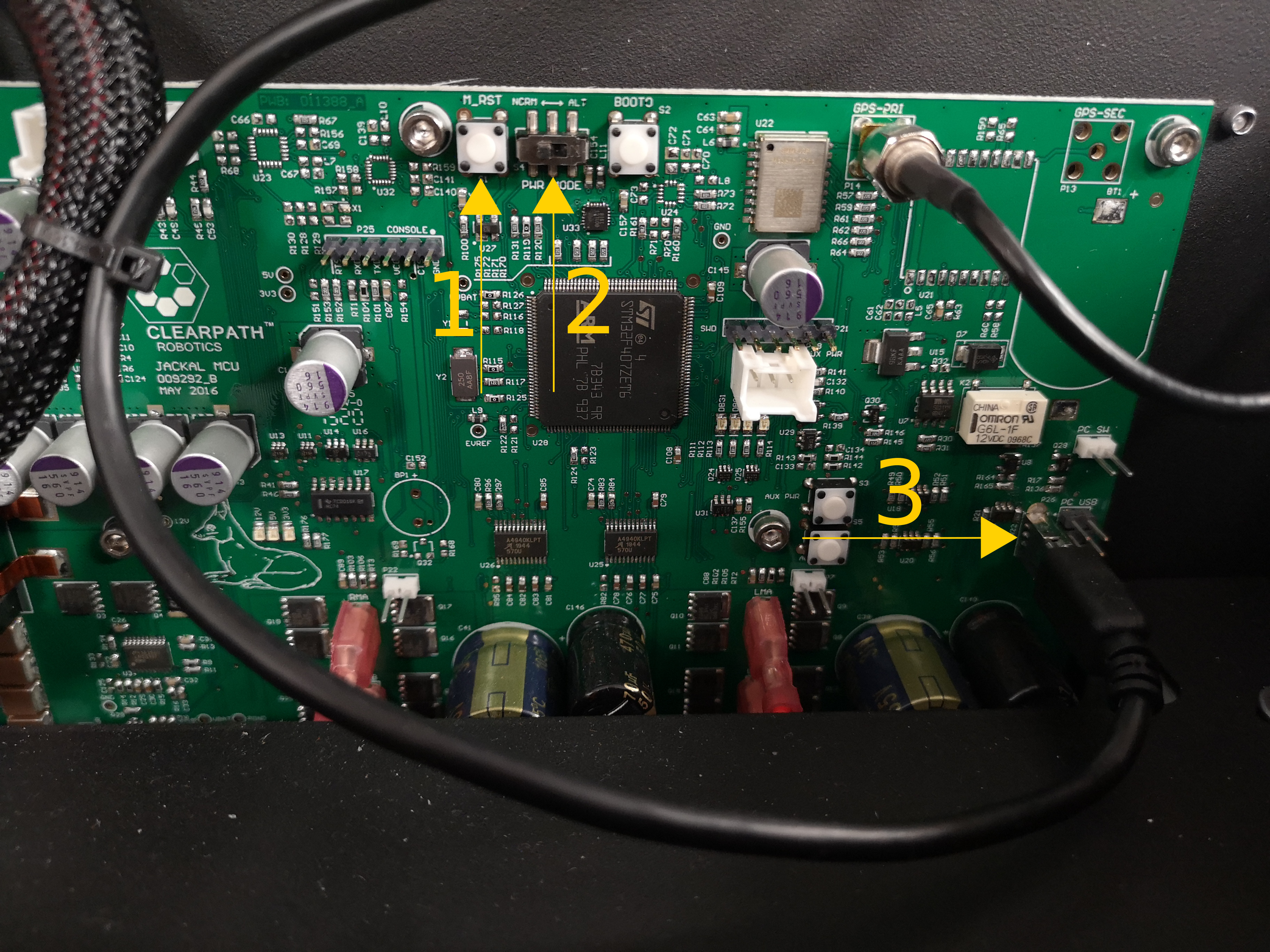 Before flashing firmware, place your robot up on blocks or disengage the drivetrain. Firmware loading does not usually result in unintended motion, but it is safest when off the ground.
