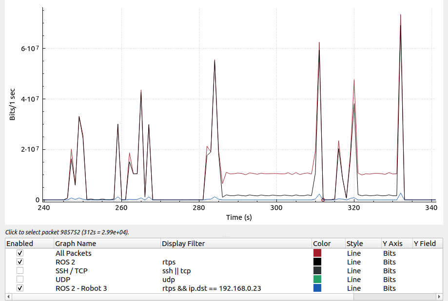 is replaced with the target bandwidth to test for in bits/sec. The size of the UDP packets can be adjusted to emulate traffic consisting of different ROS 2 message sizes. Around 100-200 bytes is a small UDP packet and around 1400 bytes is a large UDP packet: