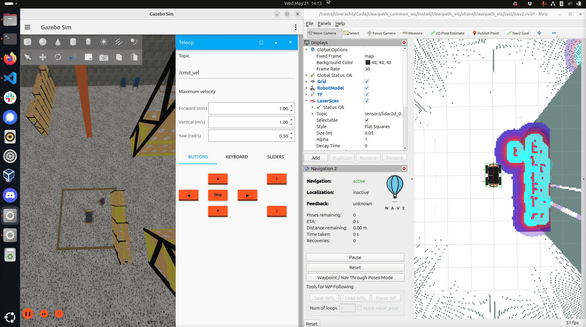 Simultaneous Localization And Mapping (SLAM) is a method of generating a map and tracking the robot's location within the map at the same time. It is generally done using laser scan data from a 2D LIDAR and the robot's odometry. For this demo we are using the slam_toolbox package to map our environment. This tutorial will use the Clearpath simulator, but will work on a physical robot too. We will be using a Husky A300 with a Hokuyo UST10 attached to the top of the robot.