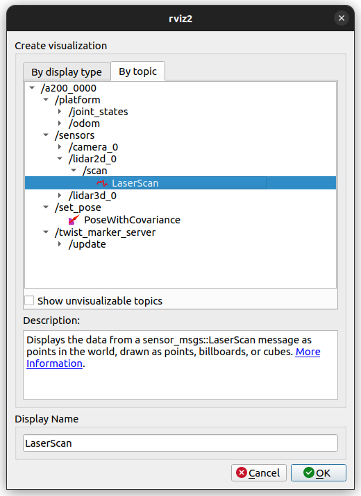 In the case of this example, a LaserScan topic was selected. LaserScan topics by default are displayed as small red dots around the robot as shown below: