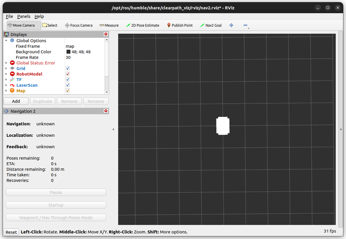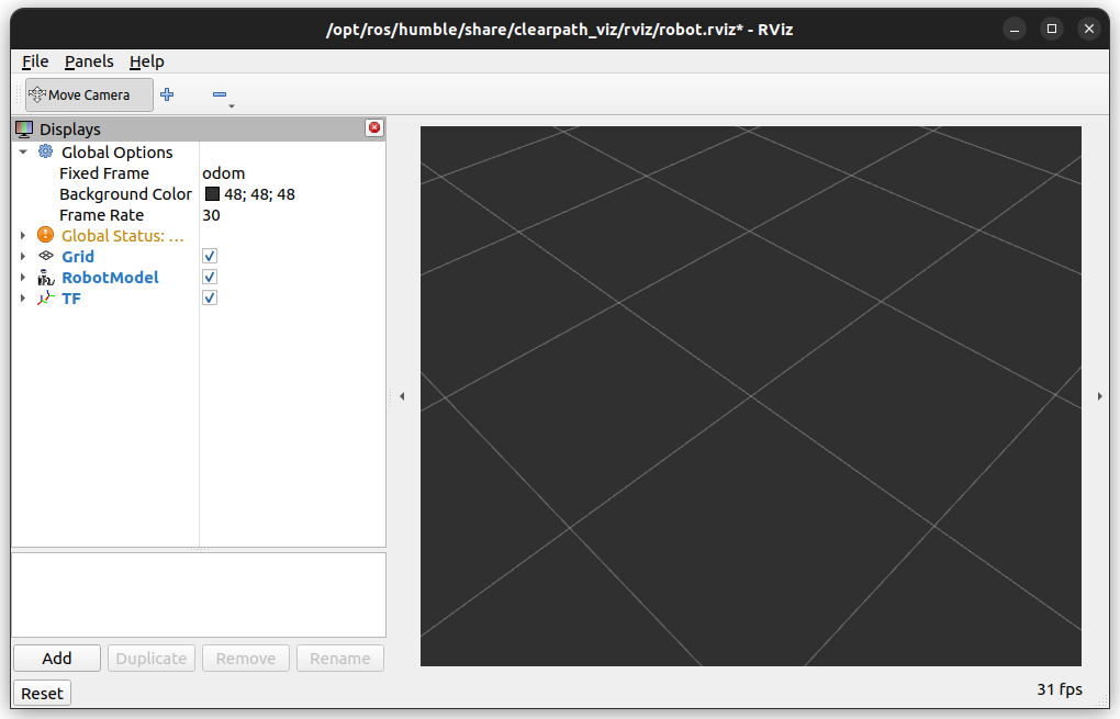 RViz is a very useful tool for visualizing the robot model and the robot sensor data. RViz must be launched on a computer that has a desktop manager and display. This means that it will not run on standard Clearpath robots since they run Ubuntu Server rather than Ubuntu Desktop.
