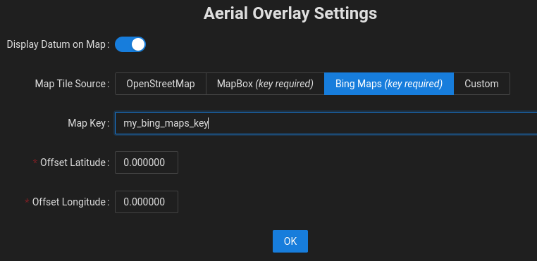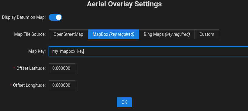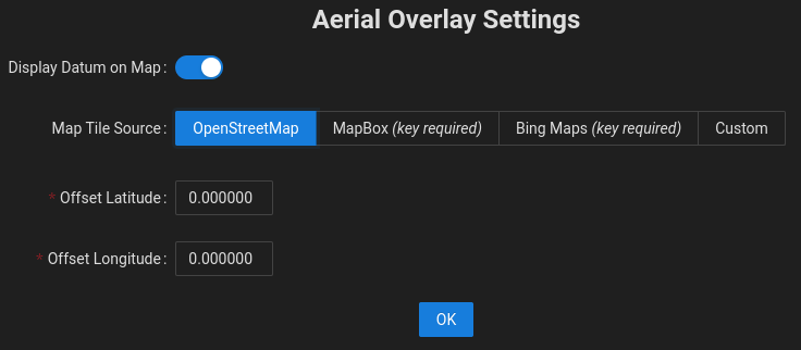 To access the Aerial Overlay Settings: Menu → Settings → Aerial Overlay: