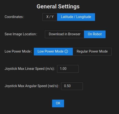 The General settings section can be found accessing the Menu → Settings → General and allows the user to modify some general settings, both for the UI and the UGV.