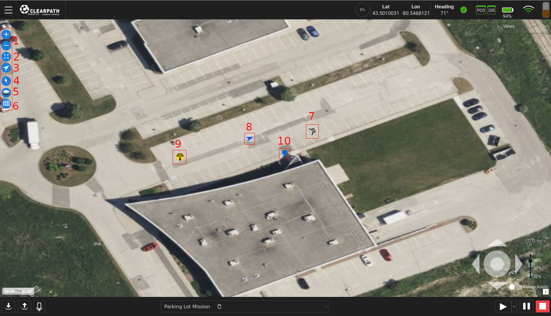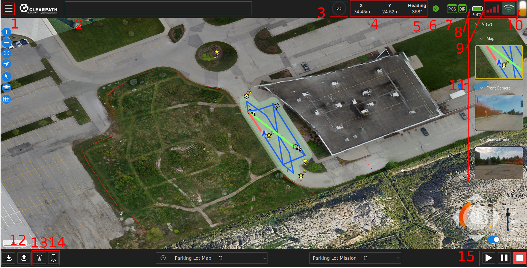 The Web User Interface (Web UI) provides a easy, graphical, means to control both manual and autonomous operation of your UGV. The following sections outline: the components and views of the UI, the details of operating in manual mode, and the details of operating in autonomous mode.