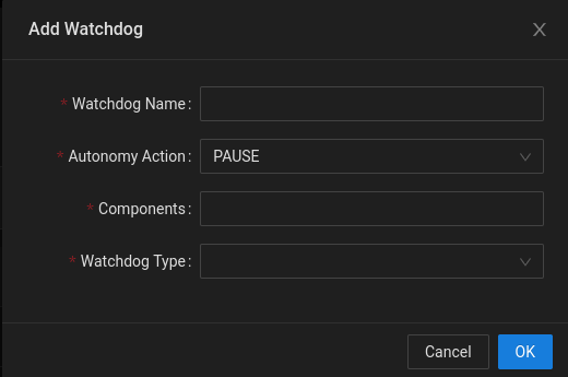 To add a watchdog, users can simply click the "Add Watchdog" button on the watchdog page. This will open up a pop up where the user can enter the required information for the new watchdog. The default parameters that need to be entered are: