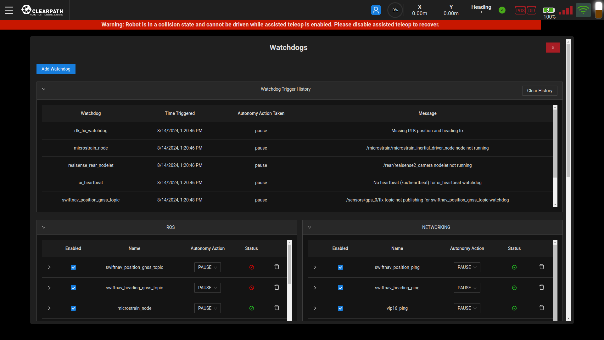 On this page you will be able to see the history of triggered watchdogs, which includes the time of day that it was triggered and the action taken by autonomy to prevent any harmful behaviour. Users can clear the history as they see fit to reduce the number of entries in the table.