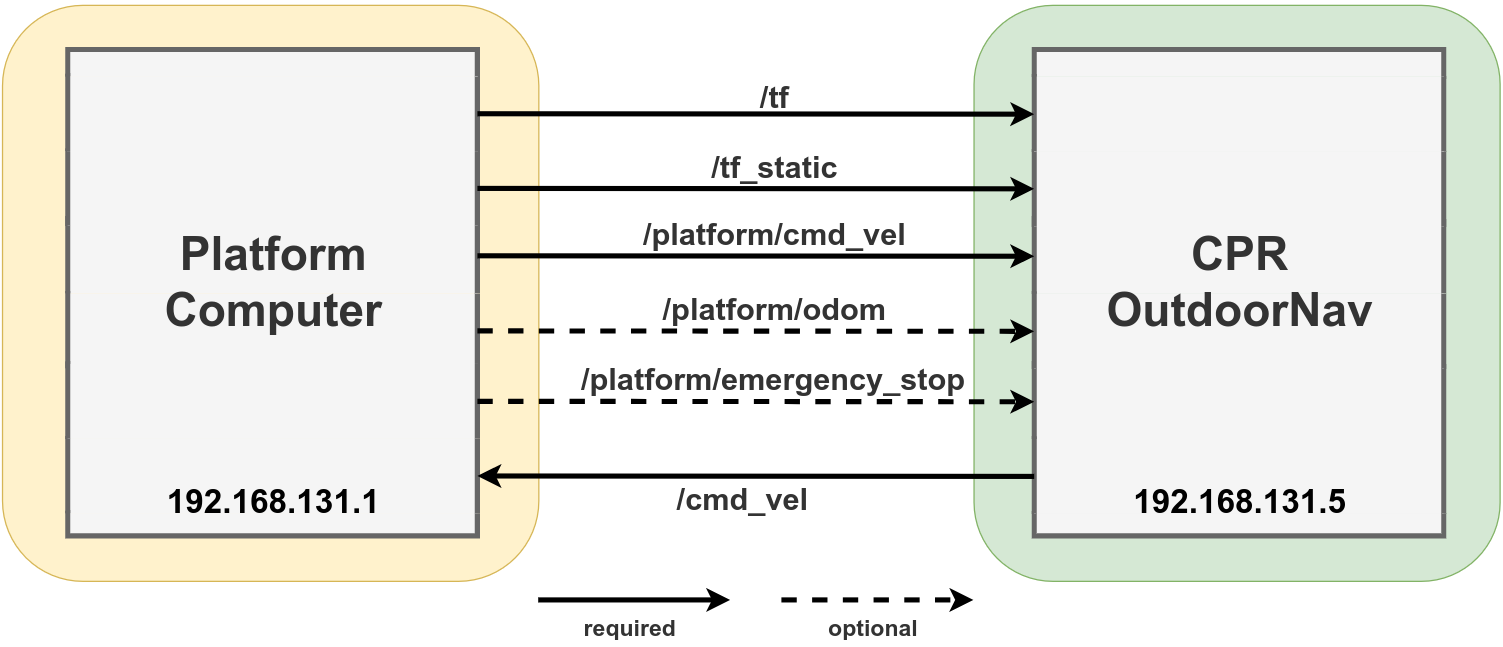 Prior to the installation and tuning of Clearpath Robotics (CPR) OutdoorNav software on your platform (robot computer), CPR requires that the platform's ROS interface satisfies the conditions listed below. Ensure that all of the requirements are satisfied for a smooth installation and tuning process.