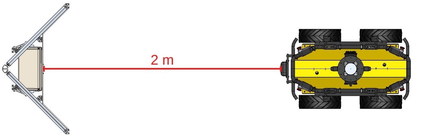 Reverse the UGV slowly so that its heading remains as perpendicular as possible to the center panel. Reverse the UGV until the front of the UGV (furthest front part) is 2 meters from the center panel (see figure above for a visual description of what the final position should look like). Centimeter precision is expected and the user should aim to get this front piece within 1-2 centimeters of the measured position (step 3).