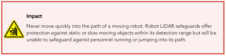 ![]() | Impact Risk | Clearpath Robotics UGVs travelling through a facility can potentially impact objects and personnel. Keep clear of all docking Clearpath Robotics UGVs. |