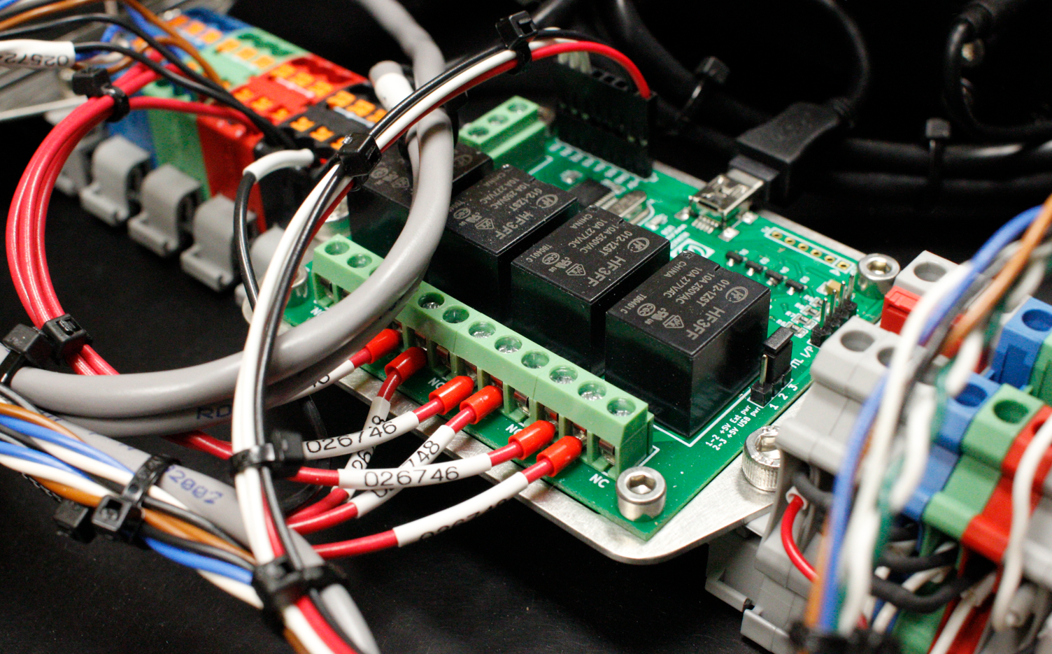We use these Relay Boards from Numato Lab® for controlling lights, larger relay-contactors, and similar powered devices. The relay board is wired to a ROS computer with a USB cable, and appears in the computer's /dev directory as a serial device. We have developed a ROS driver using Numato's API, so we can control the relays through rosservices, and monitor the GPIO inputs through rostopics.