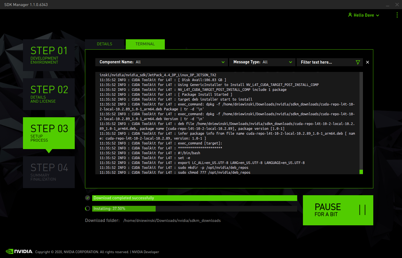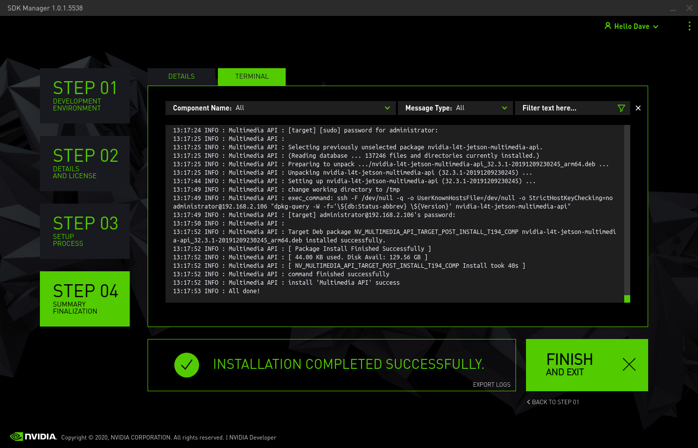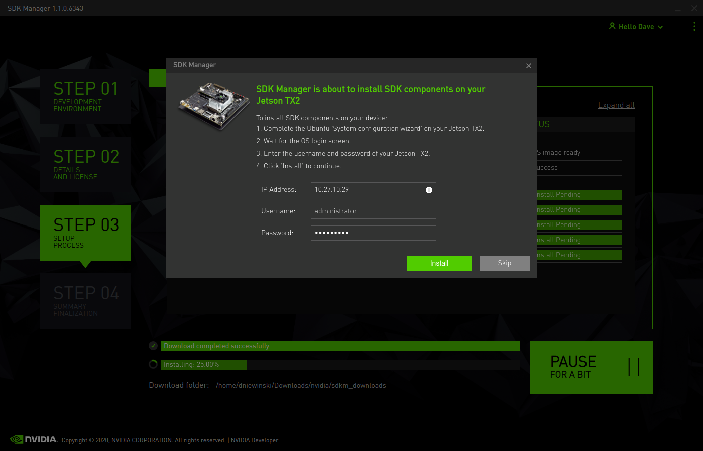 Back in your host computer, it will be waiting to install the extra SDK components on your Jetson. Enter the username, password, and IP address you found above.