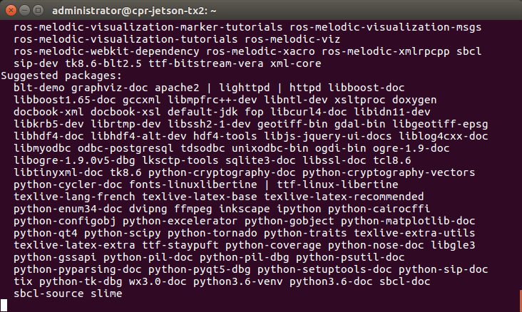 packages to get your robot up and running. Depending on your network speed it may take a long time for everything to install. Reboot the Jetson after these commands are done to complete the configuration. -