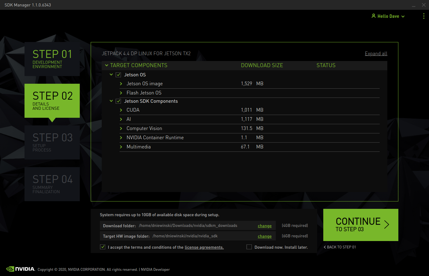 Specify the Hardware Configuration. You do not need to setup your Host Machine unless you are planning on doing Cuda work on your local computer. This can usually be disabled. Under the Target Hardware, make sure to choose TX2 or Xavier AGX to match your hardware. Once complete, click "Continue to Step 02".