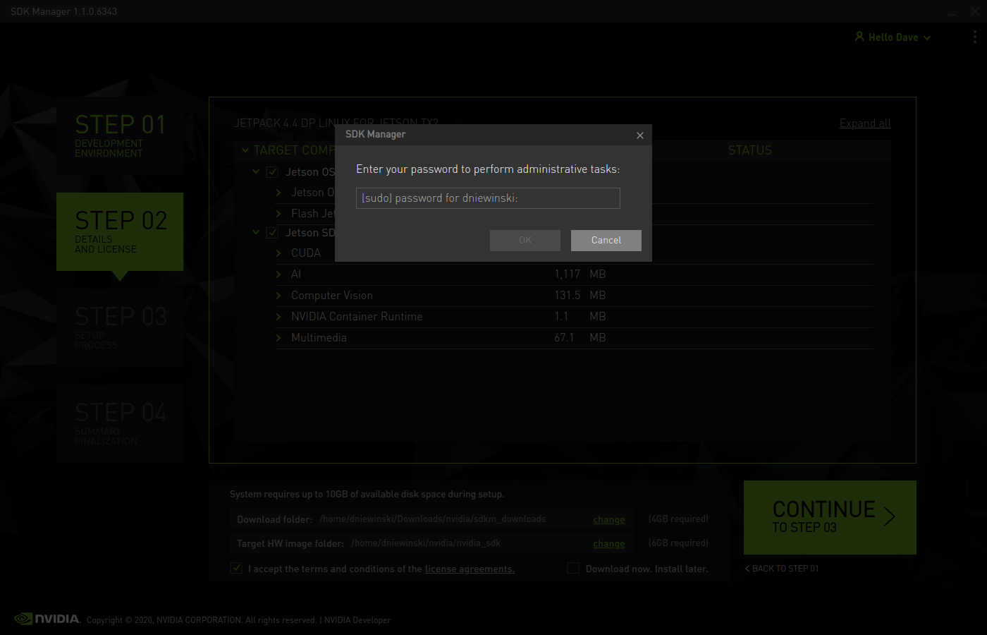 Enter your sudo password and wait for the SDK manager will download the necessary files and install the image on the Jetson.