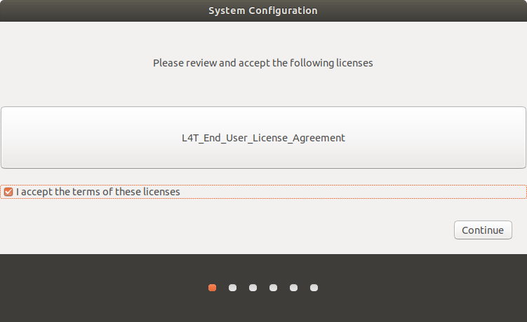 Make sure to plug a keyboard and monitor into the Jetson. On first boot, it will go through the usual Ubuntu setup steps. Accept the Licenses.