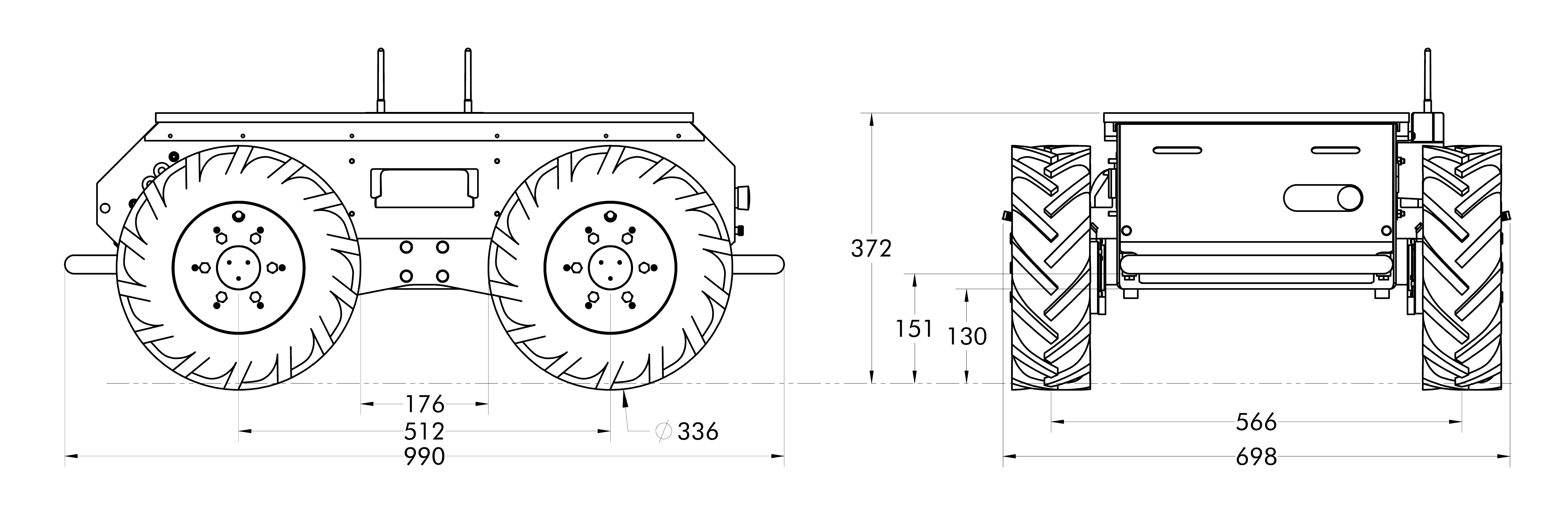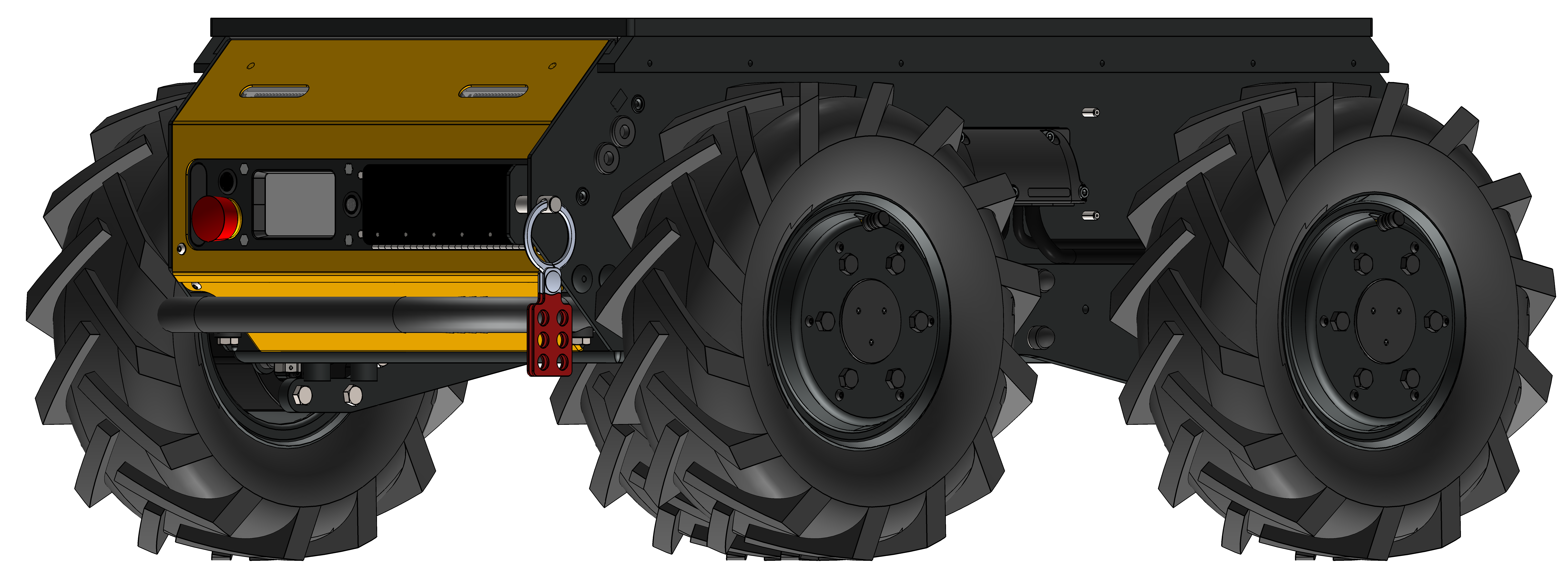 Husky has a robust structure that allows it to be picked up or reoriented by hand, using the bumper bars, or with the use of lifting machinery such as a crane, using lifting straps on the bottom of the robot. When using lifting straps, they should be positioned as shown in the images below. The lifting equipment and straps used shall be rated to minimum weight equal to the weight of Husky, including any mounted payloads. See Technical Specifications for the weight of Husky and its maximum payload.