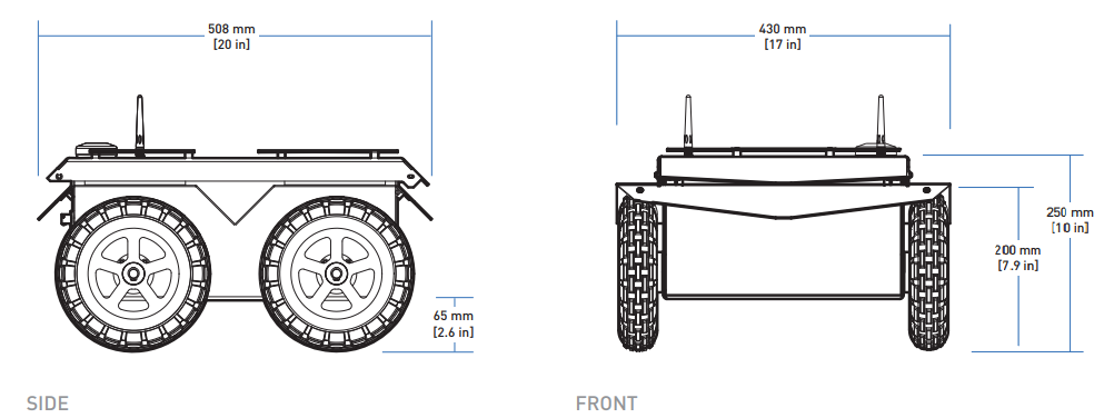 Internal Sensing | Battery Status, Wheel Odometry, Motor Currents, Onboard IMU, Onboard GPS |