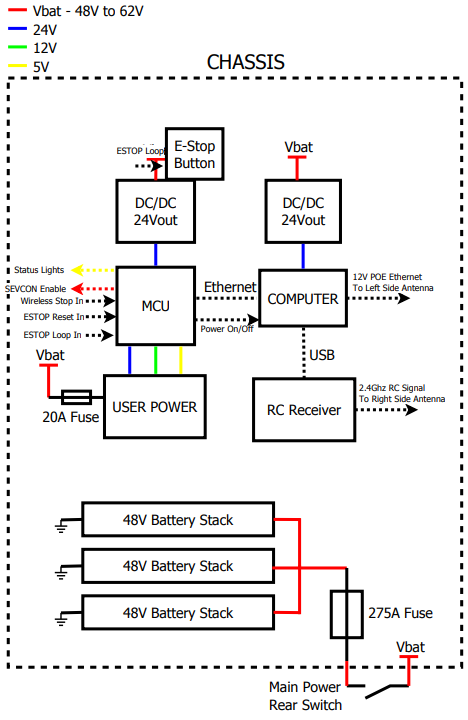 - Height of 241 mm (9.5"). This space is located at the center of the chassis between two battery packs. Consider that anything placed inside the chassis must be secured as to not move or shift during UGV operation.