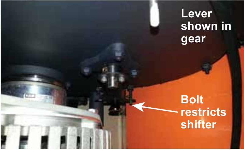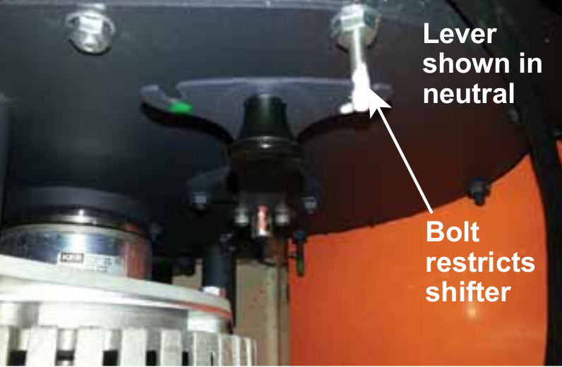 Use the bolts to restrict the lever from moving as down when the drivetrain is in neutral. The groove for the neutral position is marked with white and the bolt is also marked. This is shown below.
