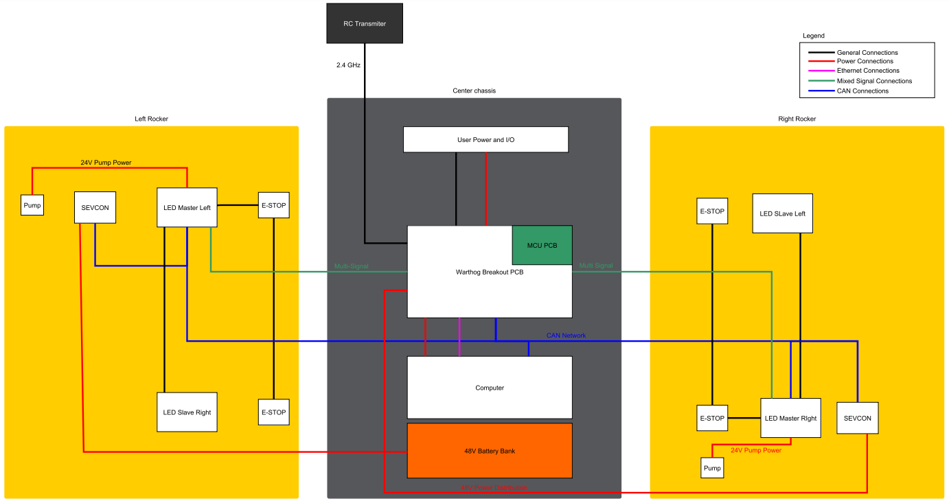 Warthog is built around an onboard computer running Ubuntu (Intel-based computer or Jetson developer kit), paired with a 32-bit microcontroller MCU. The MCU handles IO, system and battery monitoring, and provides an interface to the CAN-controlled motor drivers. The communication channel between the MCU and computer is an Ethernet connection.
